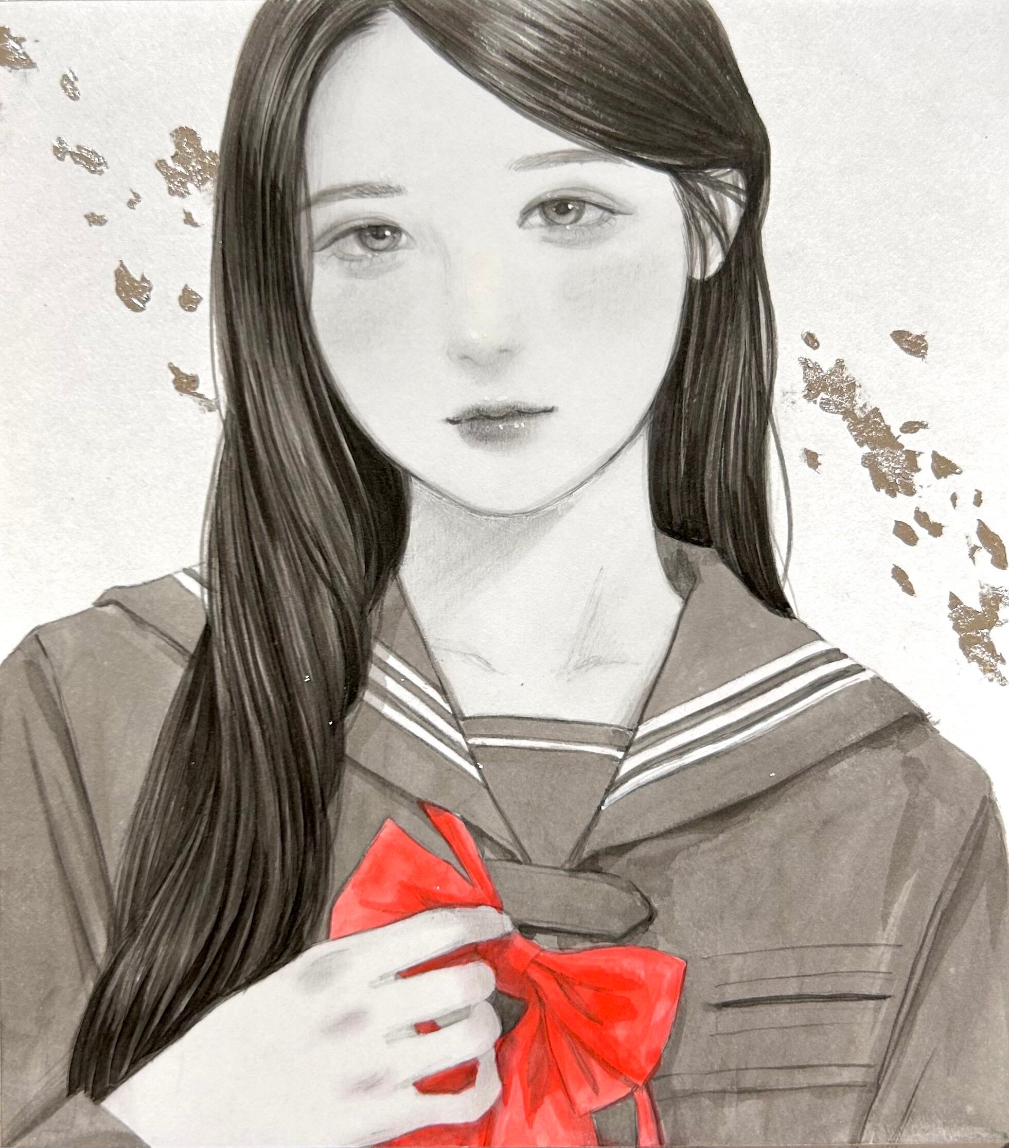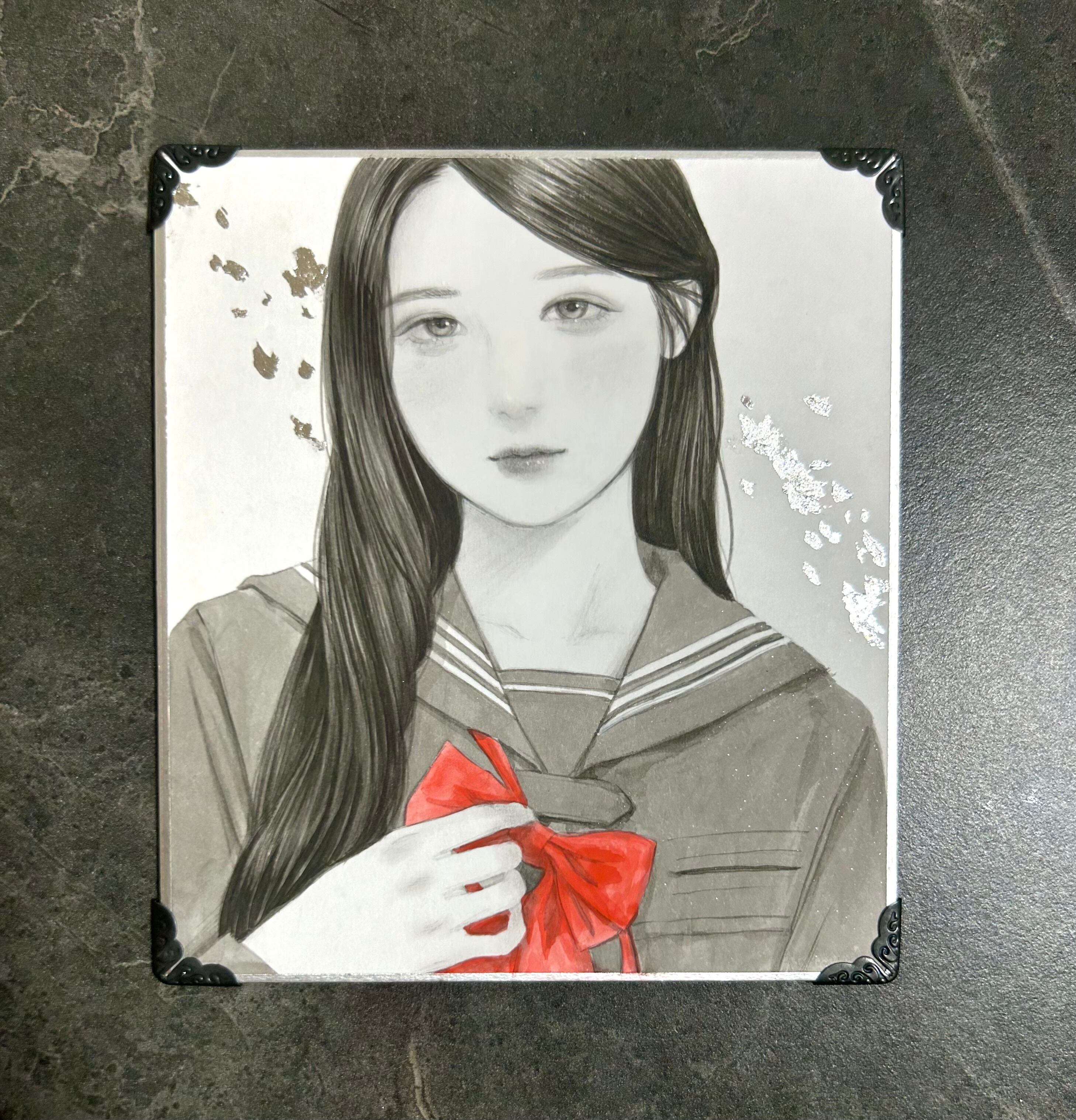 鉛筆、胡粉、水干絵の具、雲母、墨、銀箔
