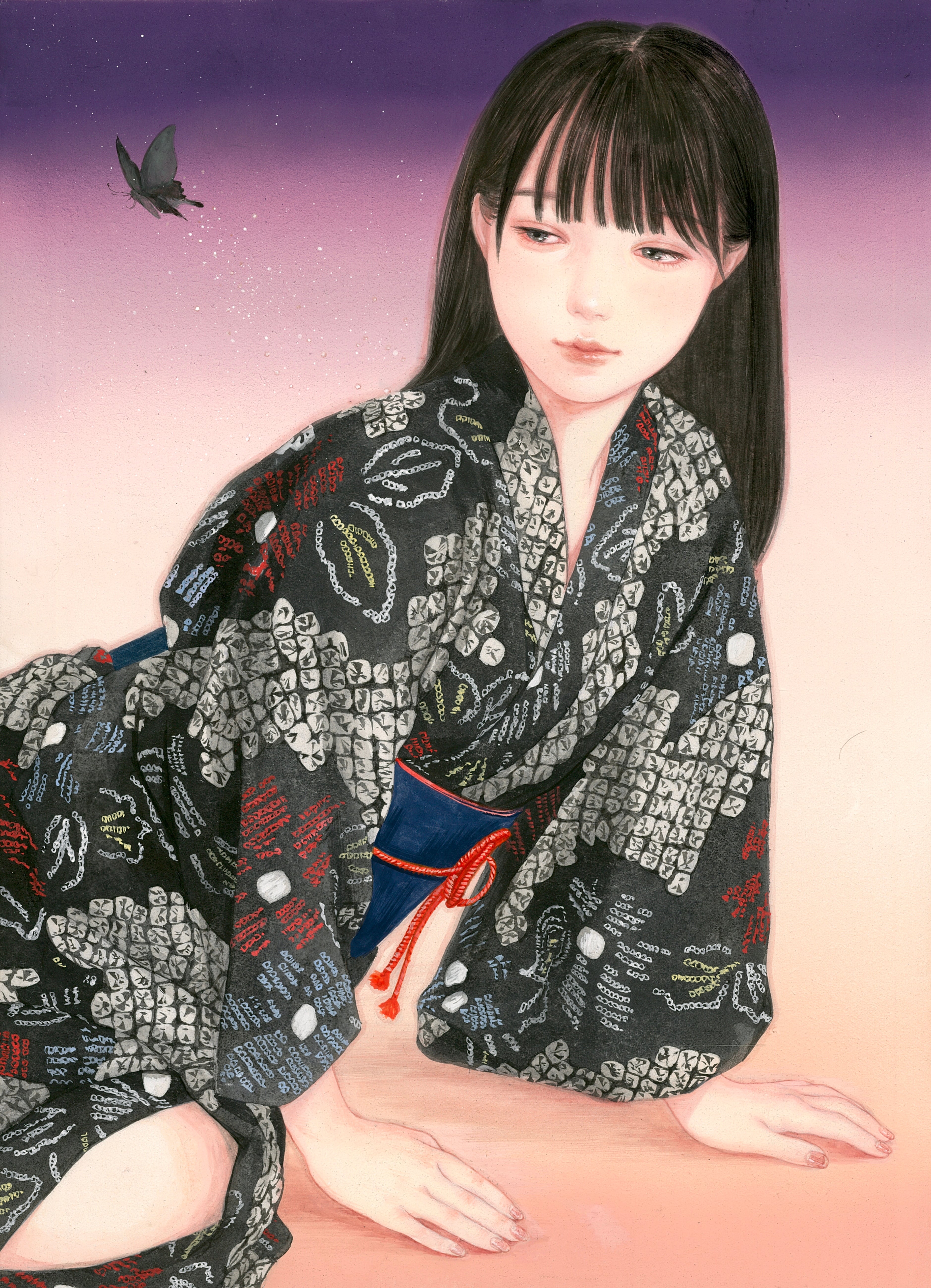 日本画 パネルに和紙、水干・岩絵具、墨、雲母